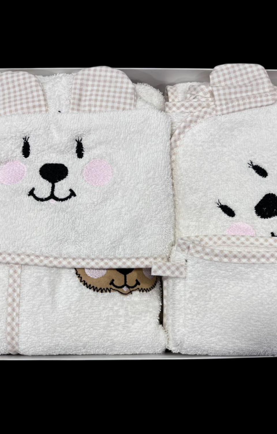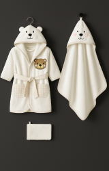- %100 pamuk malzemesiyle üretilmiş, bebek ve çocuklarınızın cildine nazik dokunuşlar sunar.; - Türk menşeli ürün, yerel üretim kalitesini evinizin konforuna taşır.; - Bornoz, havlu ve kese olmak üzere üç parçadan oluşan set, banyo sonrası ihtiyaçlarınızı karşılar.; - Bebek ve çocuklar için özel olarak tasarlanmış unisex tasarım, her cinsiyetten miniklere hitap eder.; - Şık kutu içerisinde sunulan bu set, hem hediye olarak idealdir hem de düzenli saklama imkanı sağlar.; - Beyaz rengi ve hayvan desenleriyle neşeli bir görünüm kazandırarak banyo zamanlarını eğlenceli hale getirir.; - Standart beden seçeneğiyle farklı yaş gruplarına uyum sağlayarak uzun süreli kullanım imkanı sunar.; - 30 derecede yıkama talimatına uygun şekilde kolayca temizlenebilir; böylece hijyenik bir kullanım garanti eder.