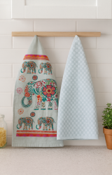 2'li mutfak peçete seti – biri renkli desenli, diğeri sade dokuma desene sahip.