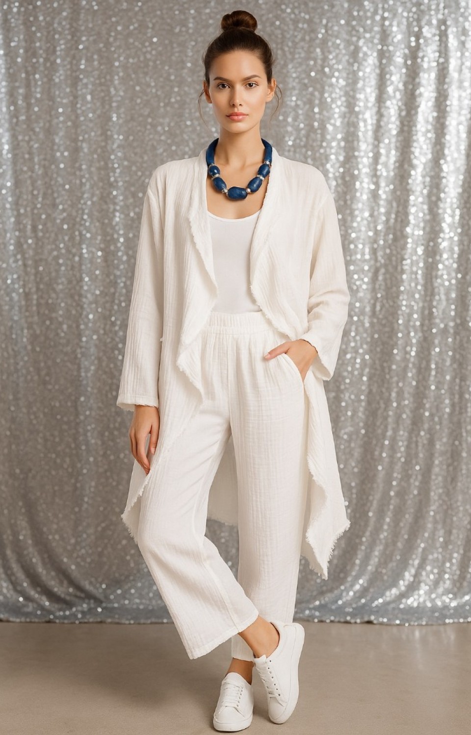 LaraLisa Collection Cep Detaylı Dökümlü Eskitmeli Müslin Bohem Ceket Beyaz