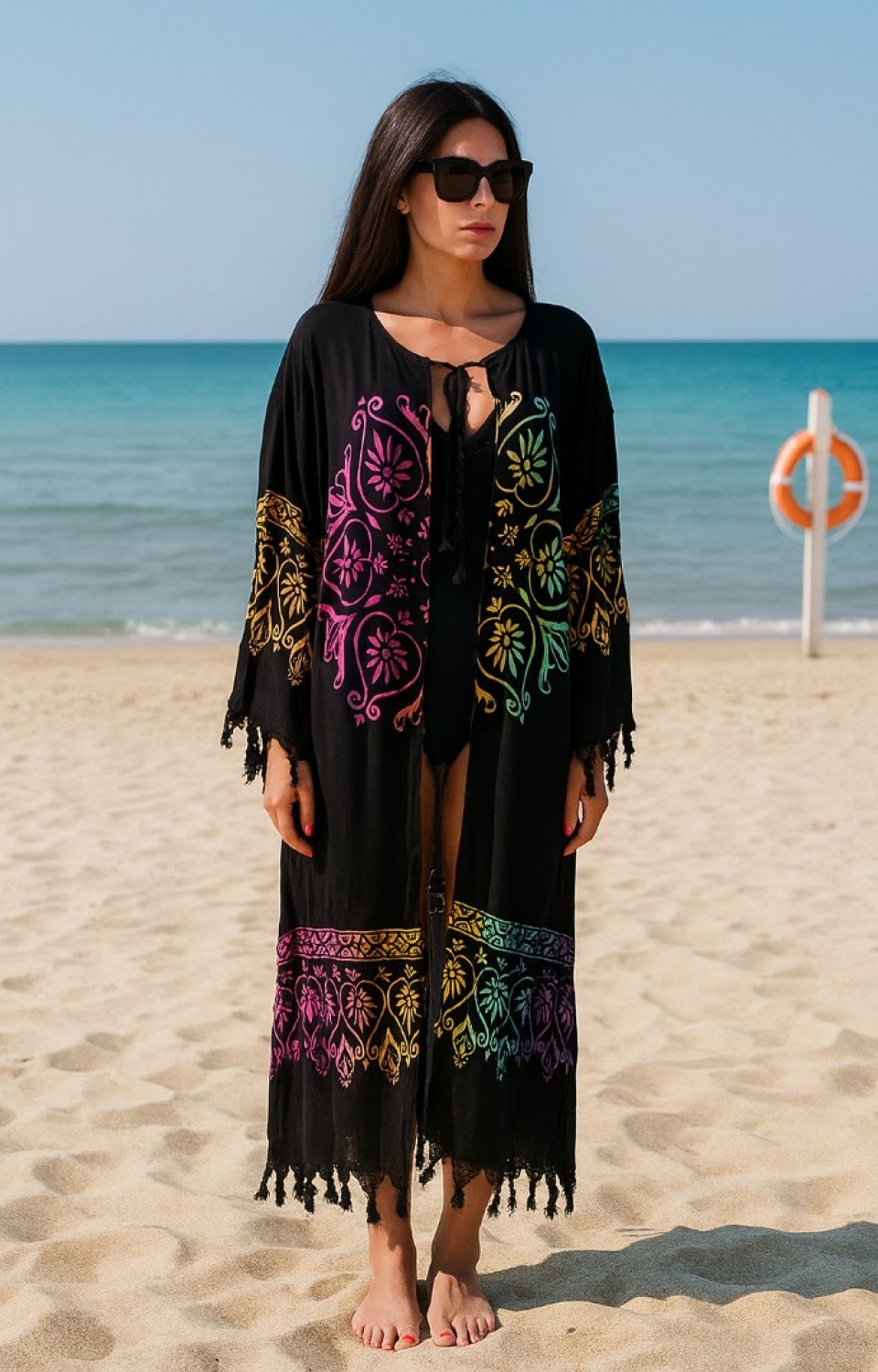 - Zarif desen baskısı ile plajda şıklığınızı koruyun.; - Bağlama veya bağcık detaylarıyla kolayca ayarlanabilir ve rahat bir kullanım sunar.; - Sexy tasarımıyla dikkat çekici bir görünüm kazandırır.; - Püskül detayları ile feminen dokunuşlar ekler.; - Yuvarlak üst silueti sayesinde rahat hareket etme özgürlüğü sağlar.; - Oversize kesimiyle yaz aylarında serinlik ve konfor sunar.; - 30°C'de yıkama imkanı, bakımını kolaylaştırır ve uzun ömürlü kullanım vaat eder.; - Yetişkin kullanıcılar için idealdir; her yaş grubuna hitap eder.; - Türkiye menşeli olmasıyla yerel üretim kalitesini yansıtır.; - Dokuma kumaşı dayanıklılığı arttırarak sık kullanıma uygun hale getirir.; - Etnik deseniyle kültürel motifleri modern tarza taşır.; - Günlük ortamlarda bile stil sahibi görünmenizi sağlar.; - Uzun boyu sayesinde güneşten korurken şık duruşunu da korur.