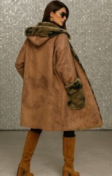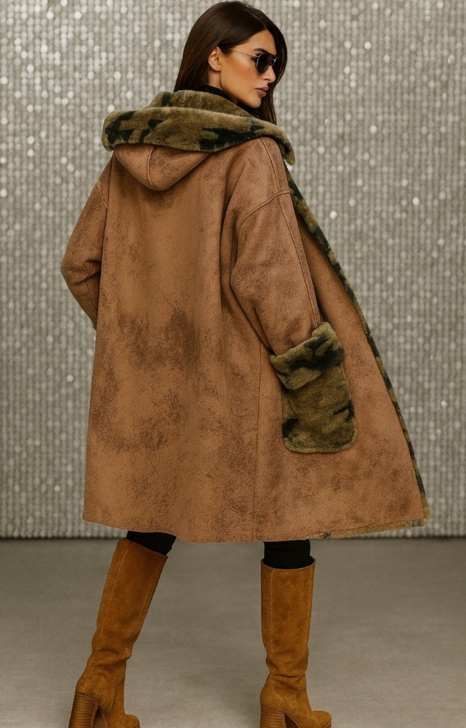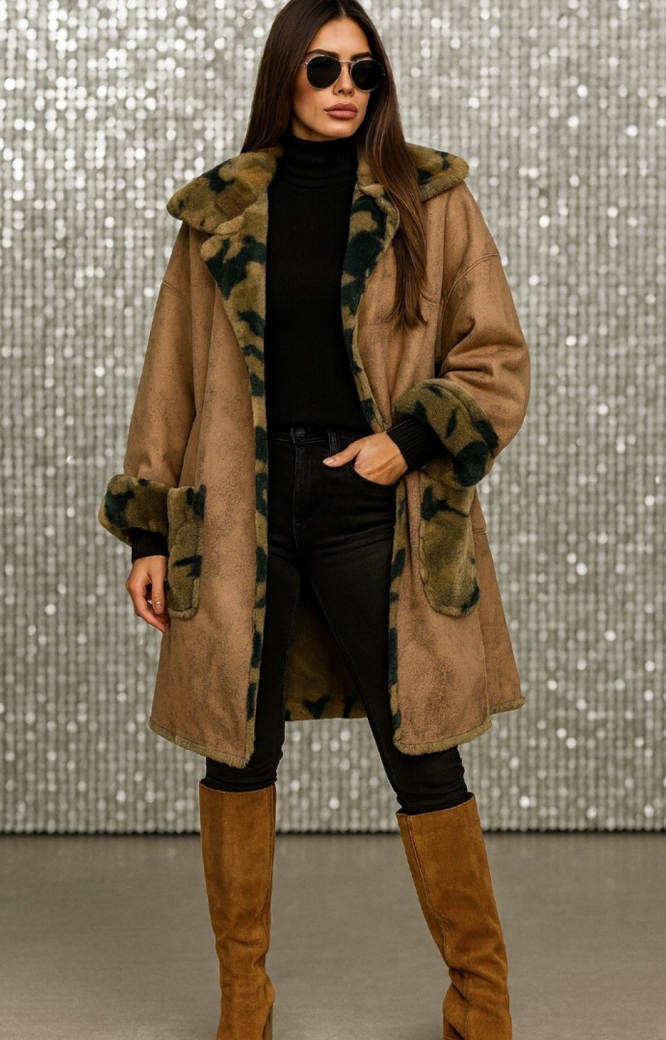LaraLisa Collection İçi Peluş Kamuflaj Desen Dışı Nubuk Kumaş Kadın Mont Taba