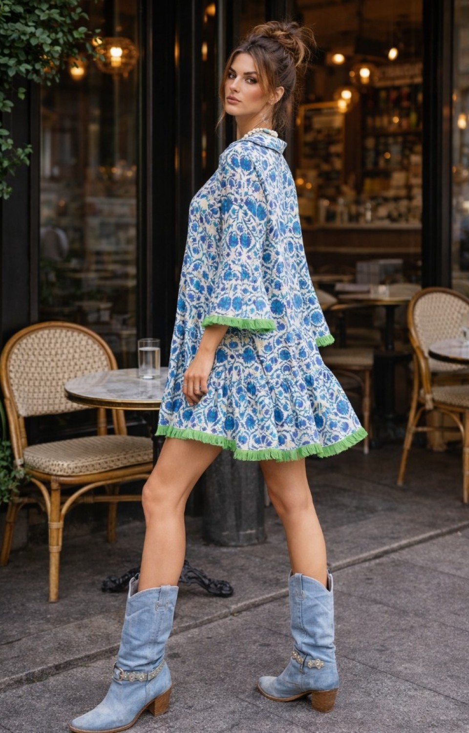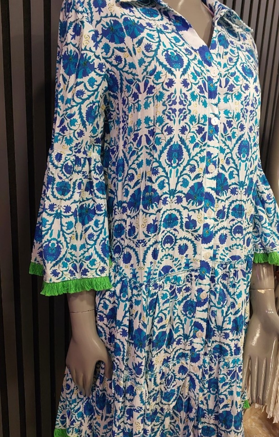 - %100 pamuklu kumaşı ile gün boyu konfor sağlar ve cildinize nefes aldırır.; - Desenli püskül detayları ile otantik bir görünüm sunar, stilinizi öne çıkarır.; - Düğmeli yaka tasarımı, hem şıklığı hem de kolay giyilip çıkarılabilme rahatlığını bir arada sunar.; - Truvakar kol kesimi ile modern ve zarif bir siluet oluşturur.; - Dijital baskı tekniği ile canlı ve kalıcı desenler elde edilir, uzun süreli kullanım için idealdir.; - Fırfır kol detayı ile feminen bir hava katarken, kloş kalıbı hareket özgürlüğü sağlar.; - İlkbahar ve sonbahar mevsimleri için idealdir; orta kalınlıkta kumaşı sayesinde mevsime uygun konfor sunar.; - Genç ve dinamik bir tarzı yansıtan bu elbise, günlük kullanım için mükemmeldir.; - TR (Türkiye) menşeili olup, yerel üretim kalitesini ve işçiliğini temsil eder.; - Dokuma kumaş tipi, dayanıklılığı ve şık görünümüyle öne çıkar.36-40 beden arası olanlar tercih etmelidir.;