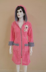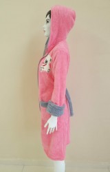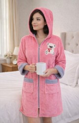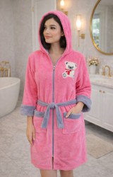 LaraLisa Collection Kapüşonlu Fermuarlı Cepli Sabit Kuşak Detaylı Pamuklu Bornoz Koyu Pembe