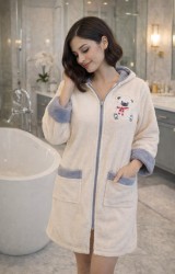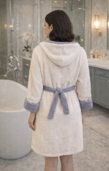 LaraLisa Collection Kapüşonlu Fermuarlı Cepli Sabit Kuşak Detaylı Pamuklu Bornoz Krem