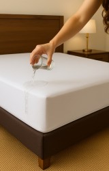 Görselde de bir miktar suyun yatağın üzerine dökülmesine rağmen yatak tarafından emilmediği, alezin üzerinde kaldığı net bir şekilde görülmektedir. Bu, ürünün en temel özelliği olan sıvı geçirmezliği vurgulamaktadır.