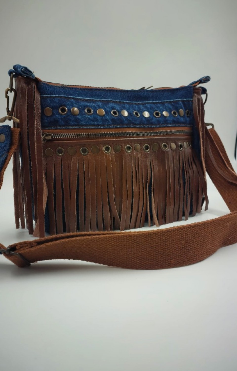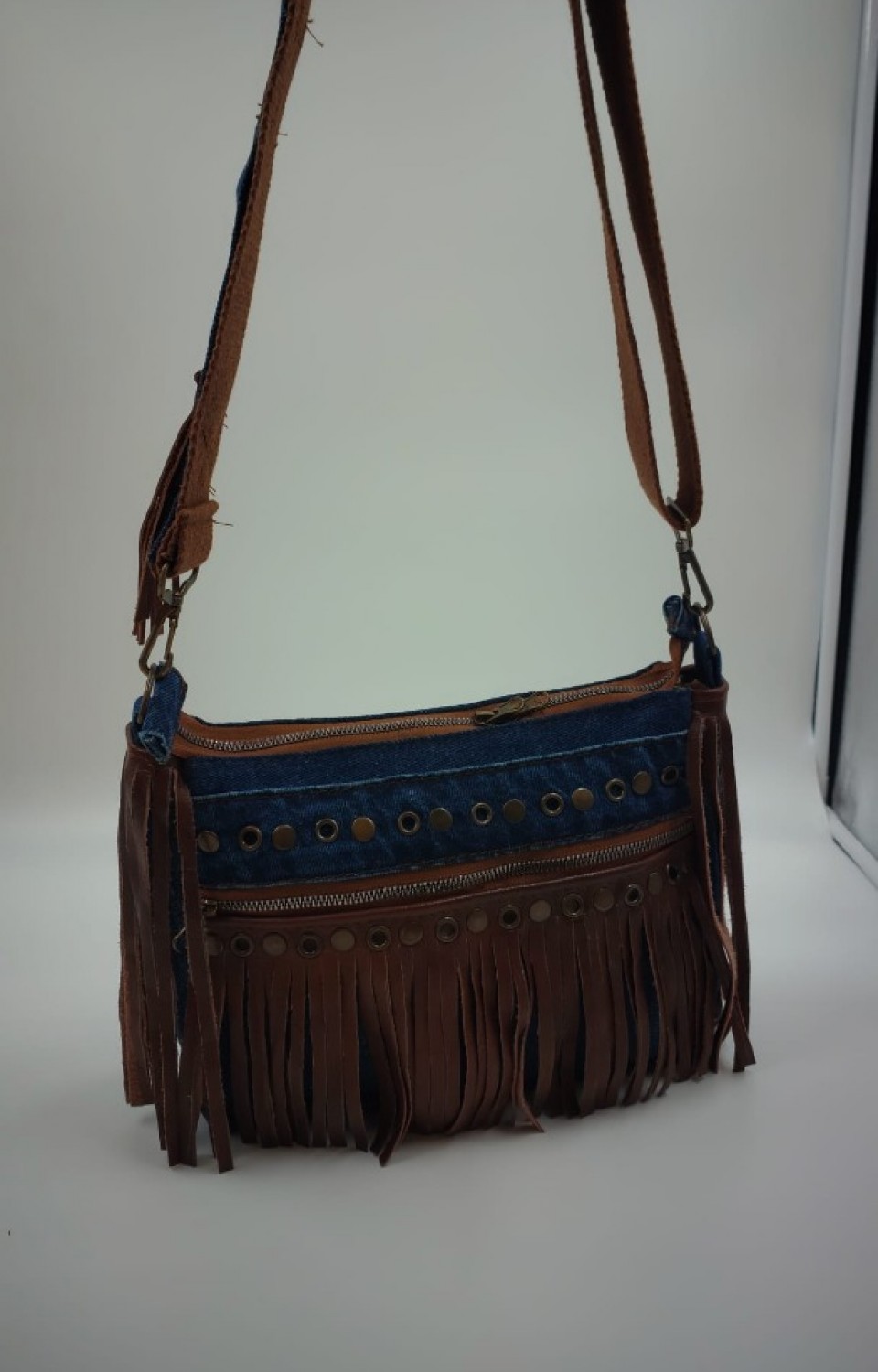 Denim aşkını bohem detaylarla taçlandırdık. Farklı kot tonlarının dikey uyumu ve çantanın her iki yanından sarkan hareketli püskül detayları, stilinize dinamik bir dokunuş katıyor. Sadece uzun omuz askısı ile tasarlanan bu model, hem çapraz hem de omuzda kullanım için mükemmel konfor sunar.